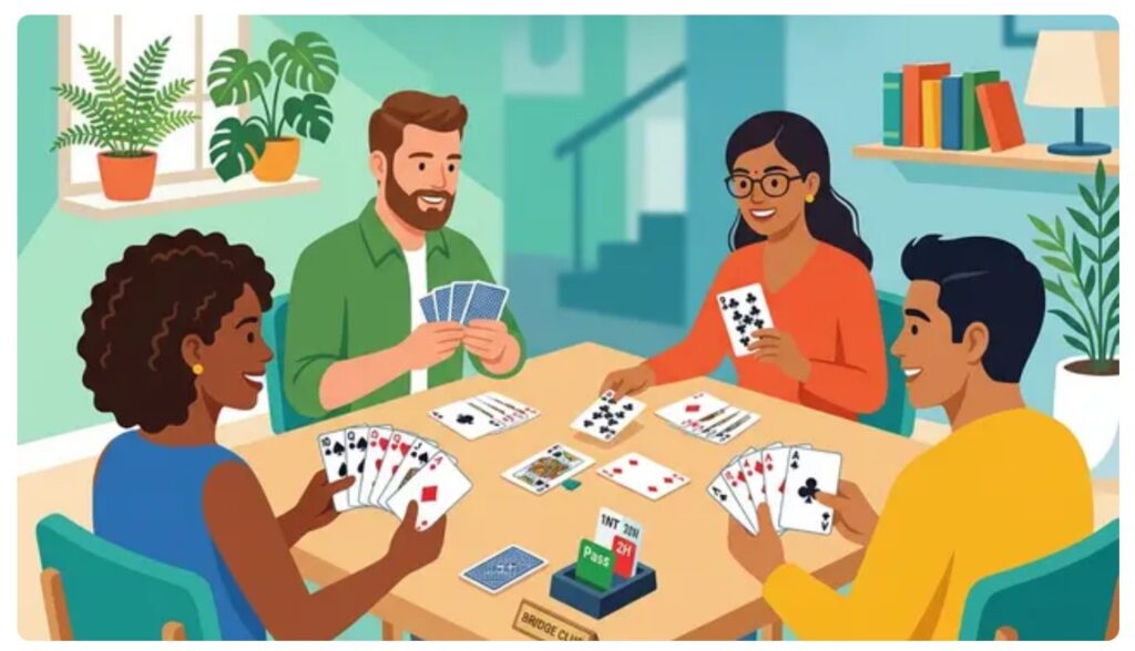 I like this picture which is cheerful and bright; but whatever these people are doing, they are not playing bridge. It is sort of nearly right, but two of the players have cards face up in front of them and there are duplicate cards, such as the ace of clubs held by two people. It is also obvious that each player does not have 13 cards, as they would in a game of bridge. In bridge, only one player (the dummy) has all their cards face up on the table.
