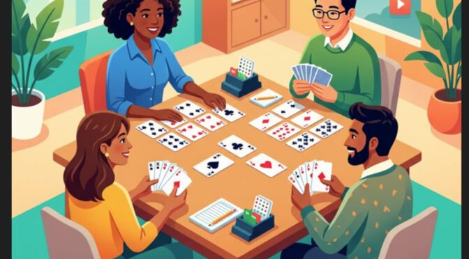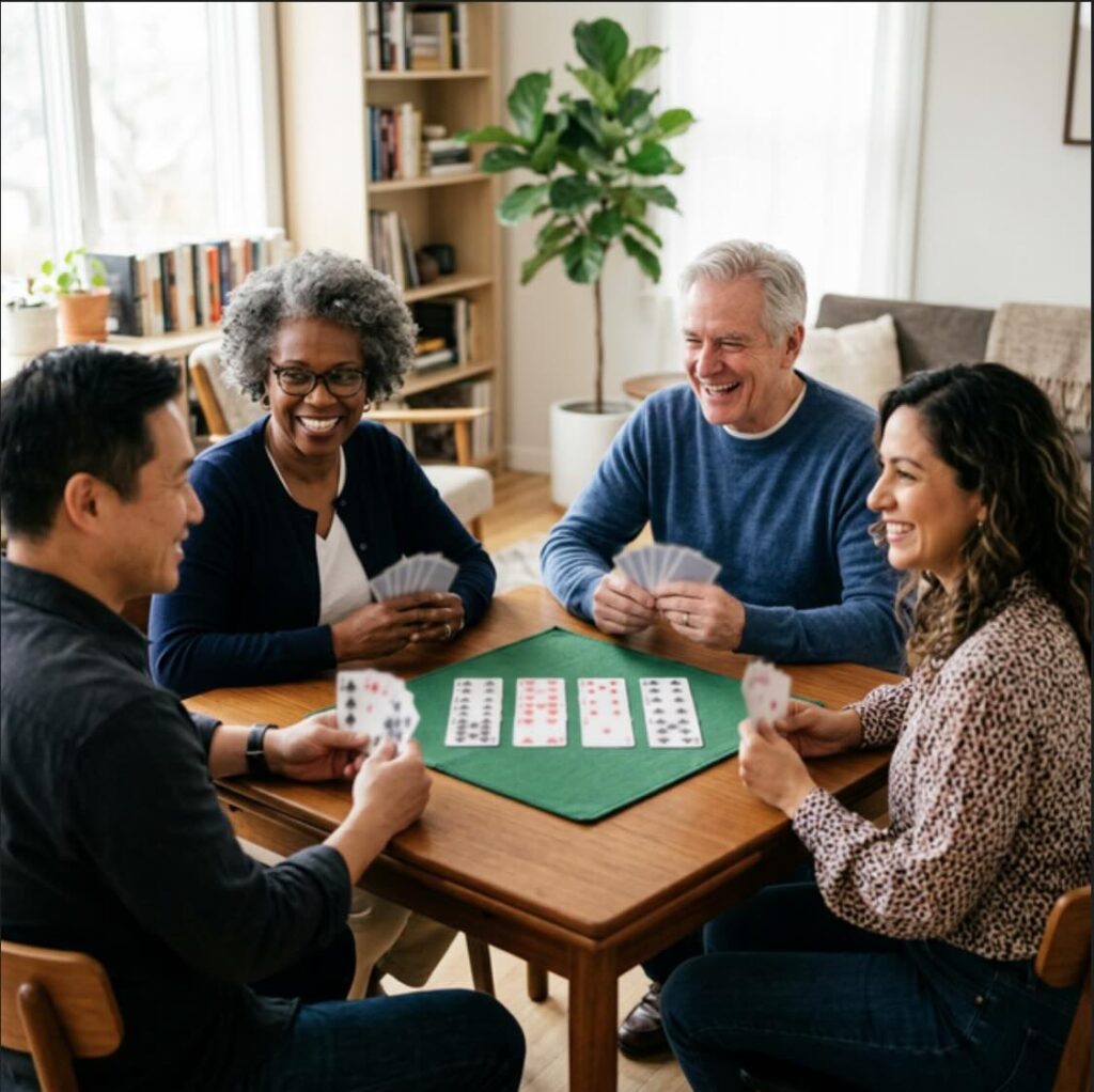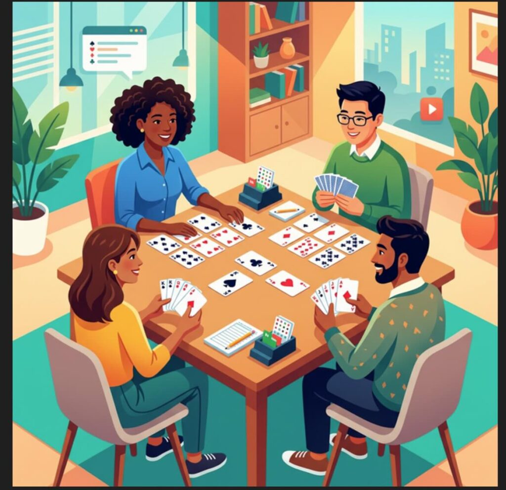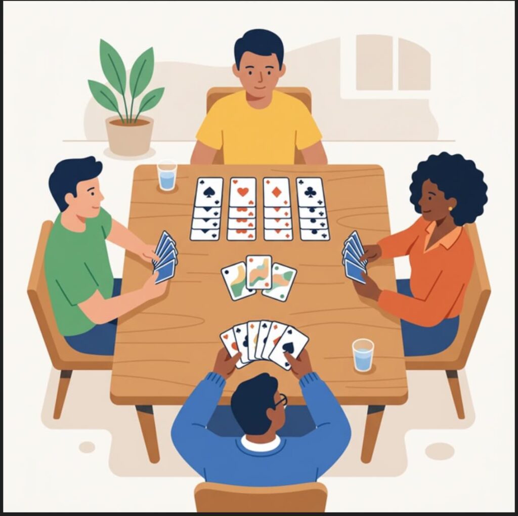 To solve the impossible duplicate cards issue, I used a photography technique in the prompt: a bokeh effect (shallow depth of field) on the cards. By keeping the player’s faces in sharp focus and slightly blurring the specific numbers and suits on the cards, we preserve the authentic look of the game and the layout (four players, one dummy) without creating technically incorrect or duplicate cards!”