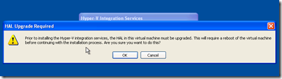 I could not activate yet though, because XP could not find a driver for the network card. The solution was to install the Hyper-V integration services, and here things started to go wrong. Integration services asked to upgrade the HAL (Hardware Abstraction Layer), a key system DLL: